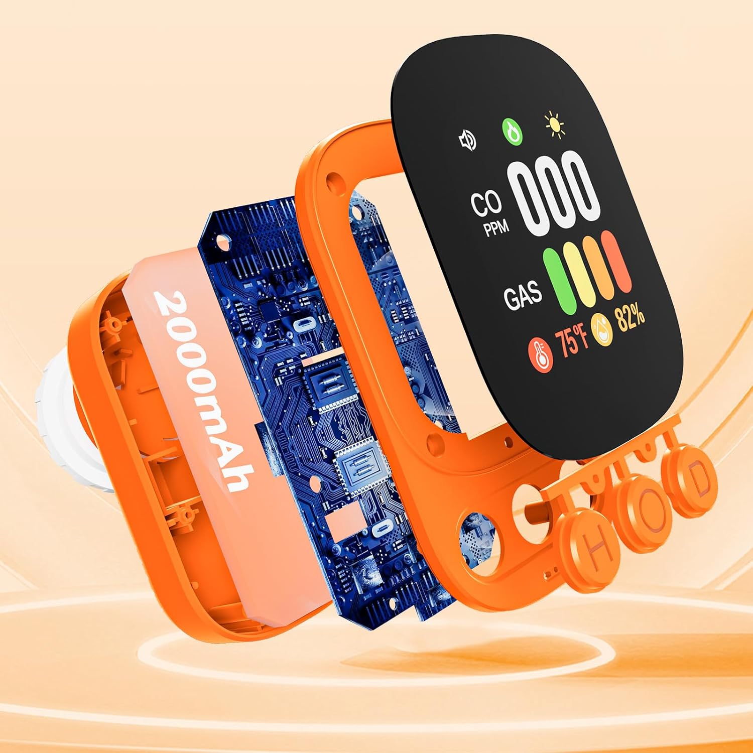 Quad Monitor: Monitors CO, gas, temp (-10°C – 50°C), and humidity (5% – 95%) in real-time. LCD updates every 2s.