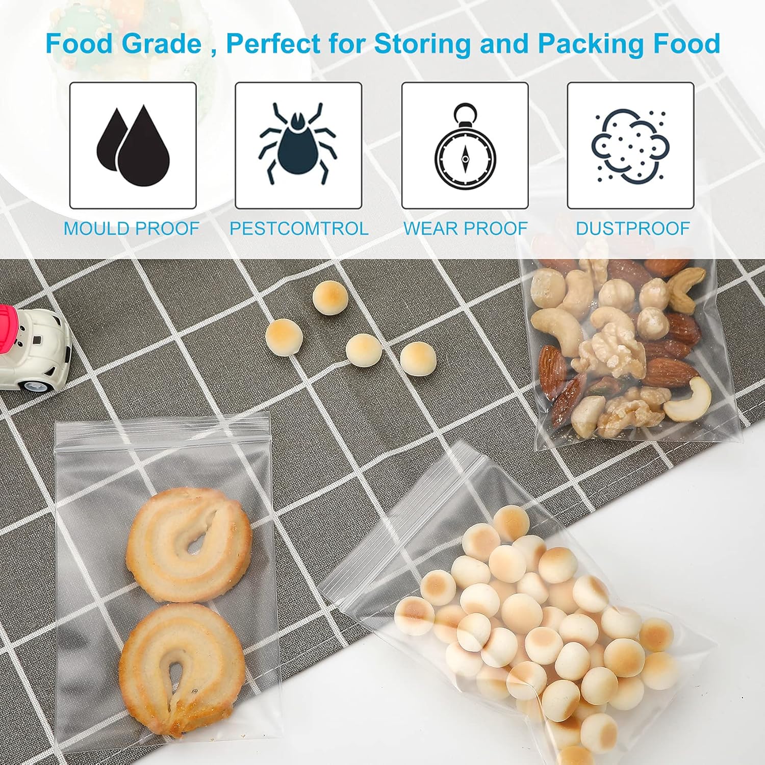 Waterproof and Seal: 100% sealed. The resealable small zipper bags are moisture resistant and will keep items dry and dust free. These small 3×4 inch mini clear zip bags are perfect for food storage, tool storage, activities, travel, carrying and transportation, etc