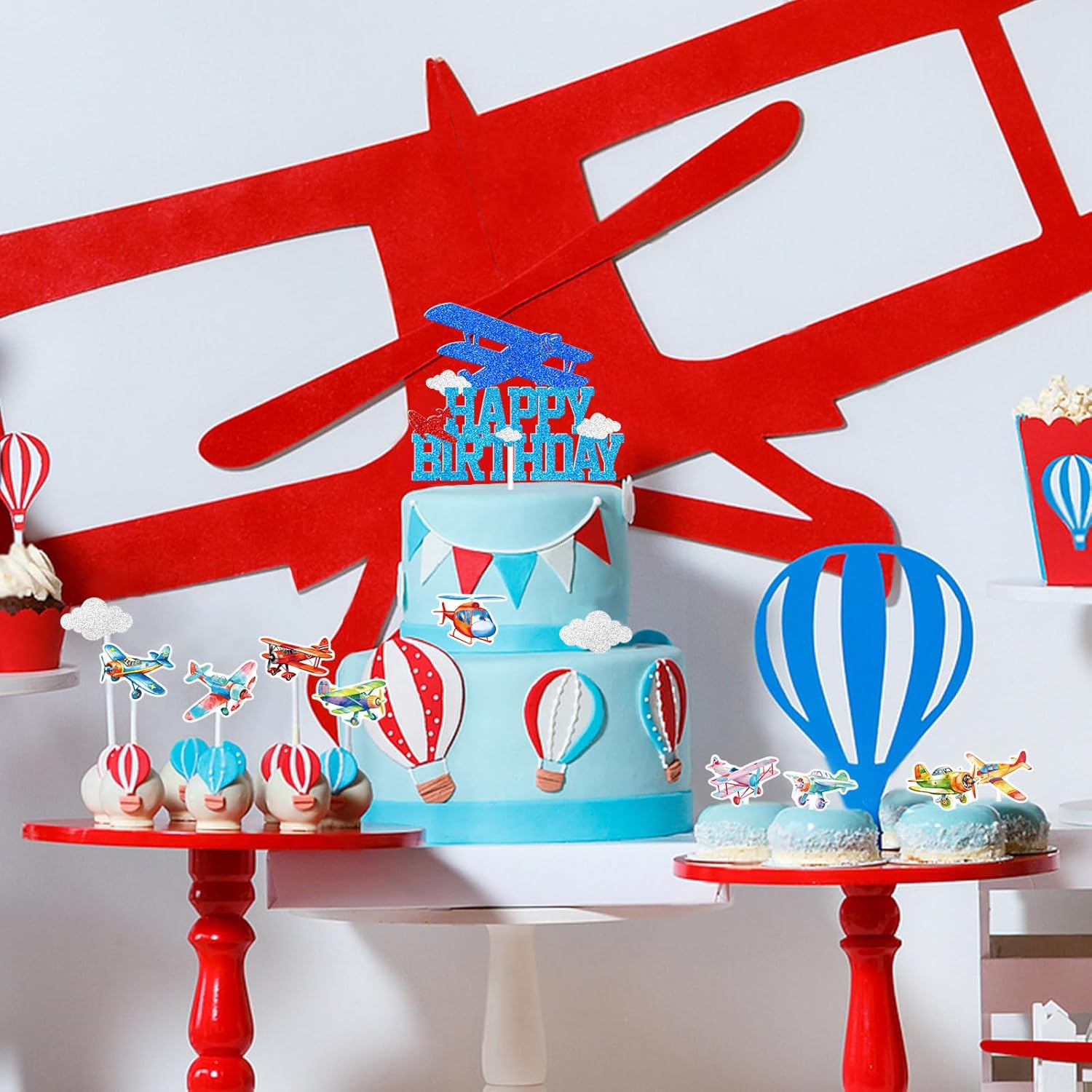 12 Pcs Airplane Birthday Cake Topper Decorations Gifts Blue Glitter Sign Cake Toppers for Boy and Girls Baby Shower Table Centerpieces