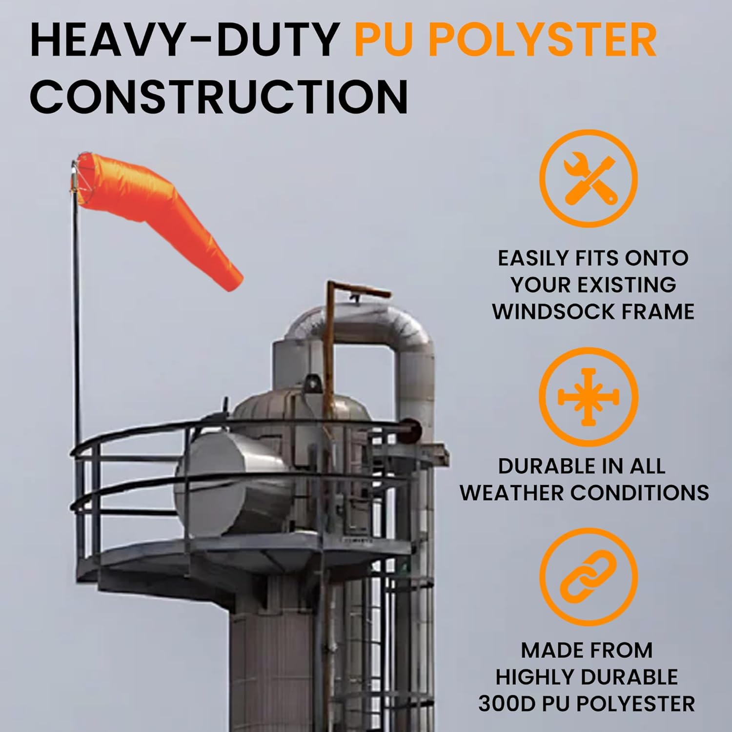 TOUGH AND WEATHERPROOF: Made from 300D PU polyester with a waterproof polyurethane coating, this windsock withstands rain, snow, and harsh outdoor conditions. Perfect for airports, farms, ranches, industrial sites, and airstrips.