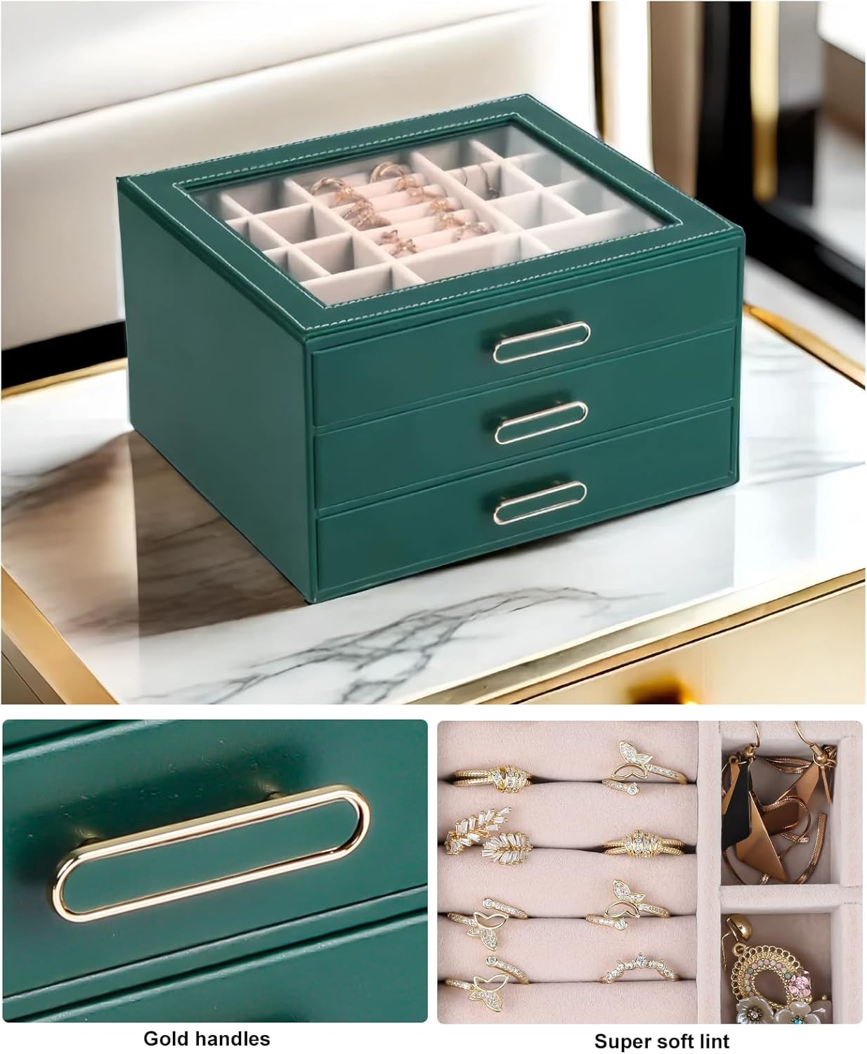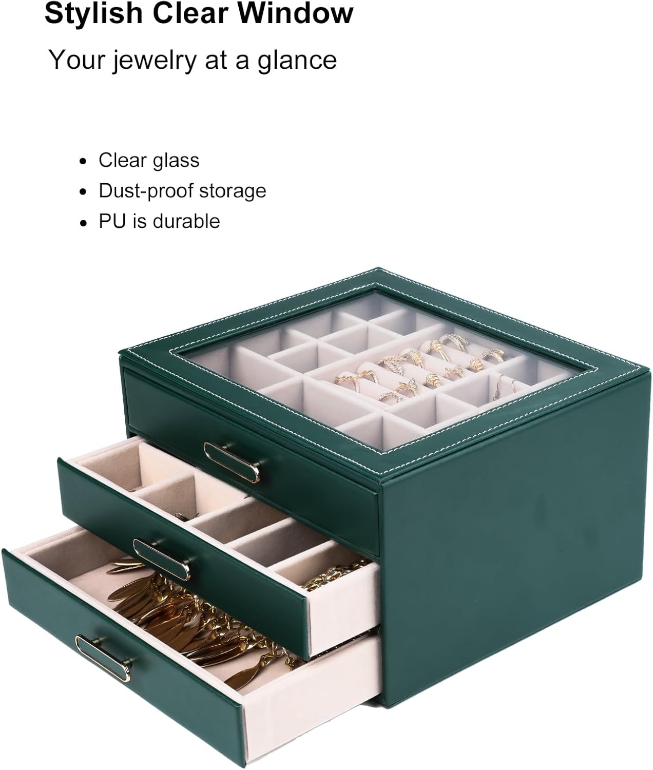 3 Layer Jewelry Organizer Box with Glass Lids & 3 Drawers – Elegant Storage Solution for Necklace, Rings,Earrings, and Bracelets – Perfect for Women ASK-301 (Green)