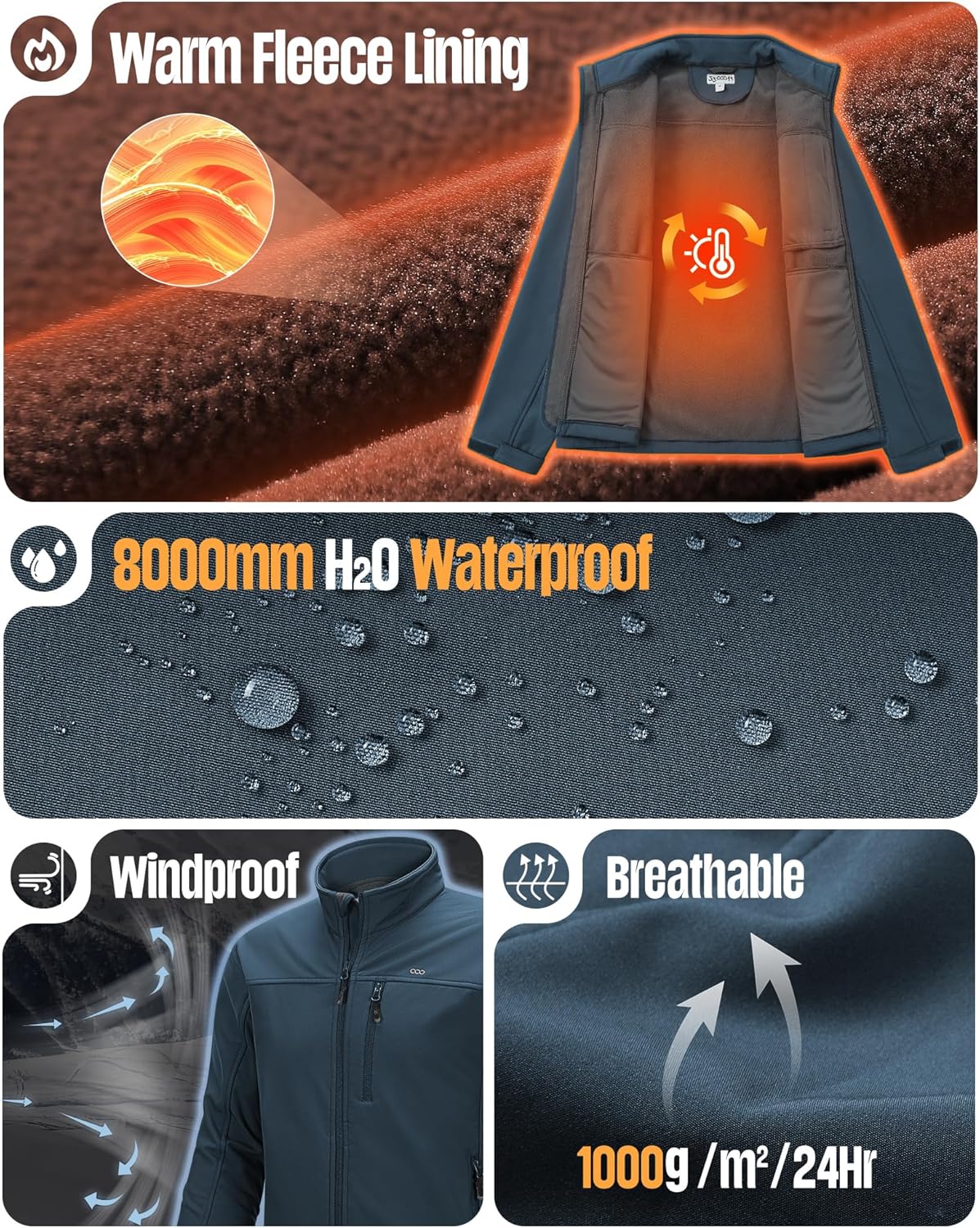 8 reviews for 33,000ft Men’s Waterproof Softshell Jacket Warm Fleece Lined Windbreaker Lightweight Soft Shell for Travel Hiking Golf
