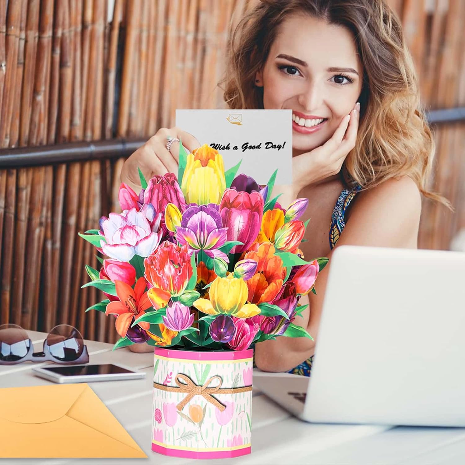 Premium 3D Greeting Card for Women: This pop-up bouquet greeting card is made of sturdy art paper with fine printing, all details are laser cut and carefully assembled manually. The recipients will love this popup card when they receive it