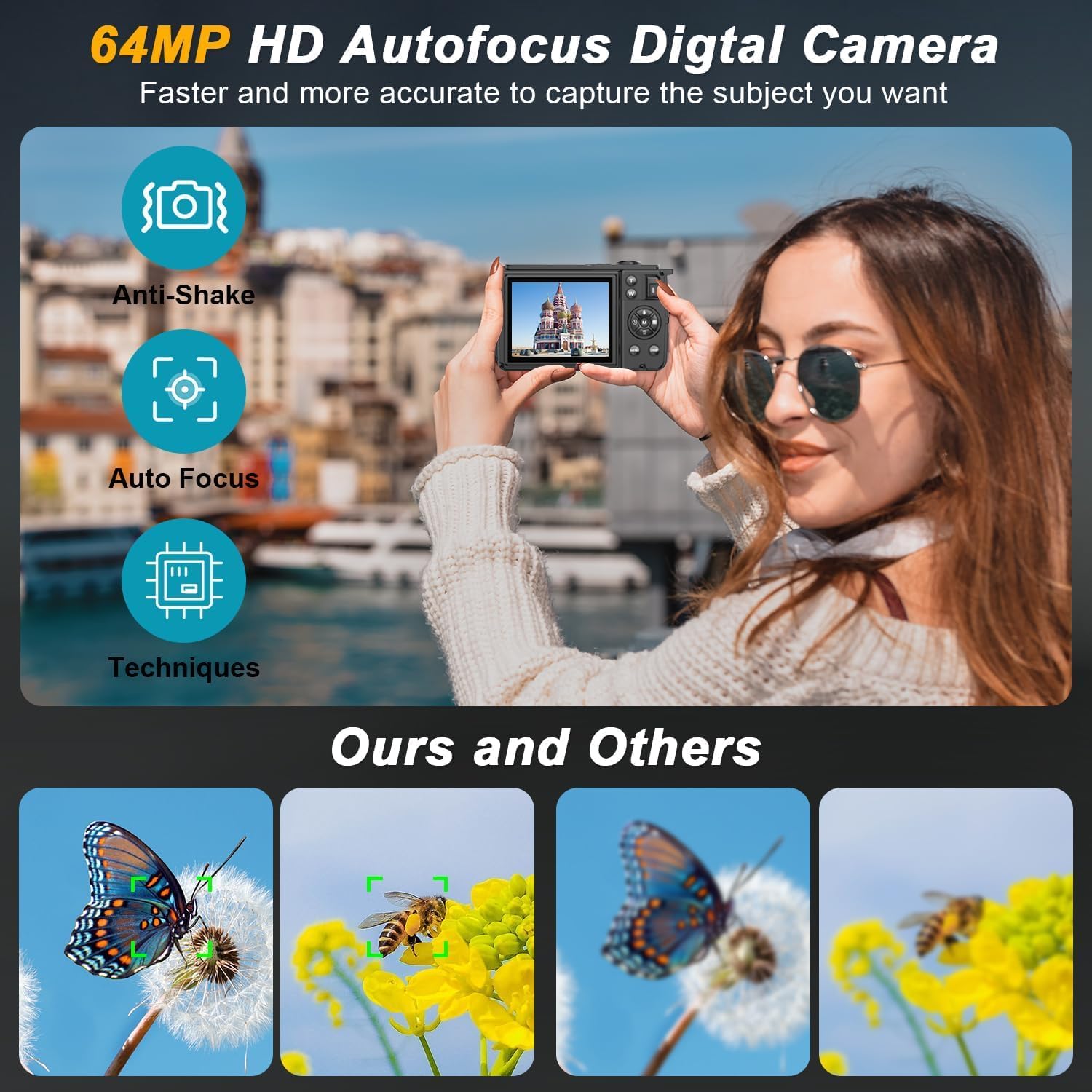 【4K 60FPS&64MP Digital Camera】The 4k compact photography camera has 4k 60FPS video resolution and 64 megapixel image resolution which can record the most exciting and memorable moments with high quality images or videos. This digital camera supports 16X digital zoom, autofocus and anti-shake to help you take HD photos easily. This camera is great for beginners, kids,students,teens and seniors.