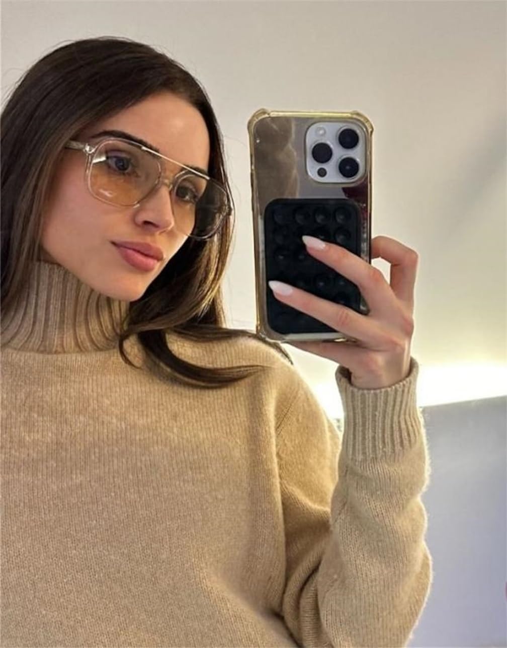 This pair of glasses flatters your face shape and is stylish. The taupe-tinted lenses are perfect for everyday wear—they add a fashionable touch without being too over-the-top. And they look amazing in photos
