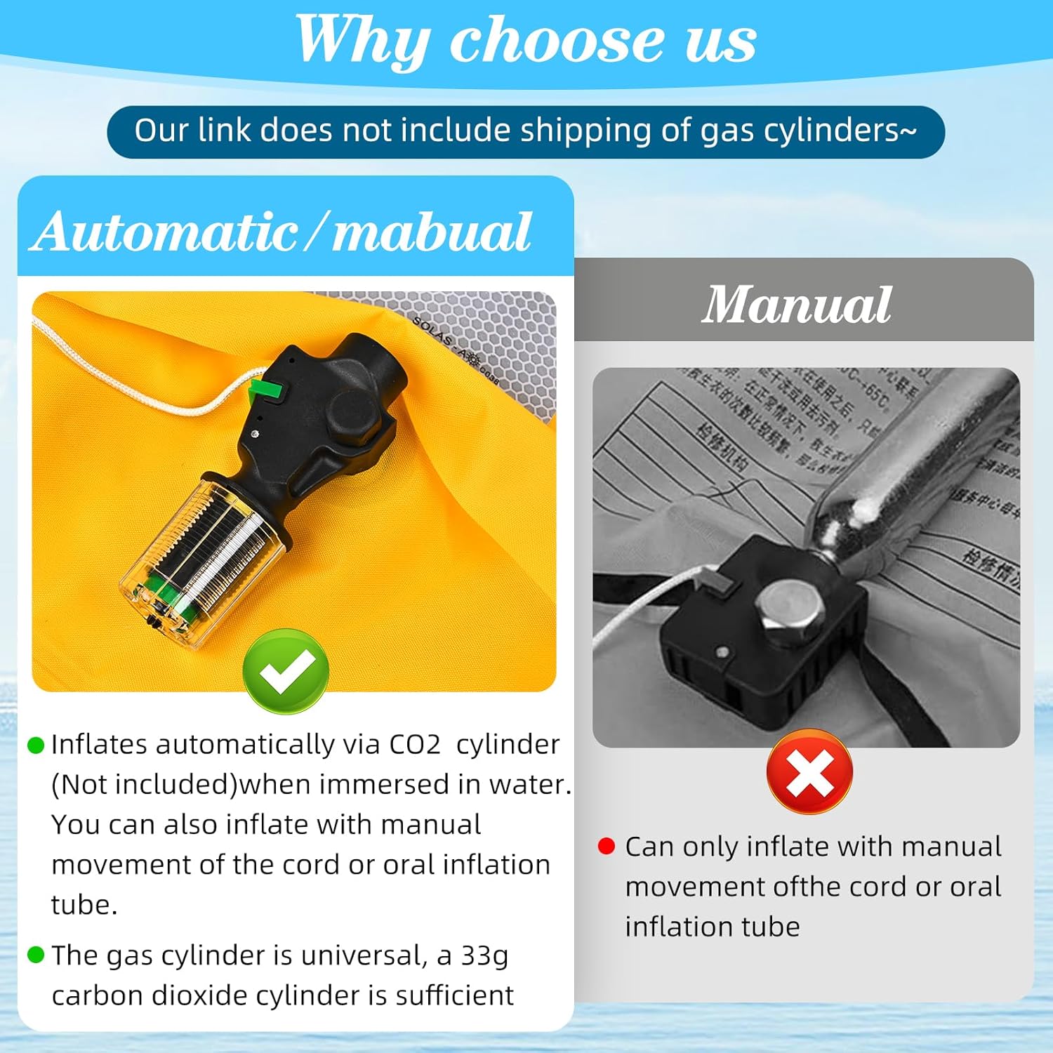 It is simple to wear, removes tedious steps, and is easy to use. Considering emergency rescue, this vest can be used by simply connecting a 33g carbon dioxide gas cylinder(Link without 33g carbon dioxide gas cylinder)to the jacket. 3-5 seconds will automatically inflate quickly, just replace the gas cylinder, this jacket will continue to use, very valuable.