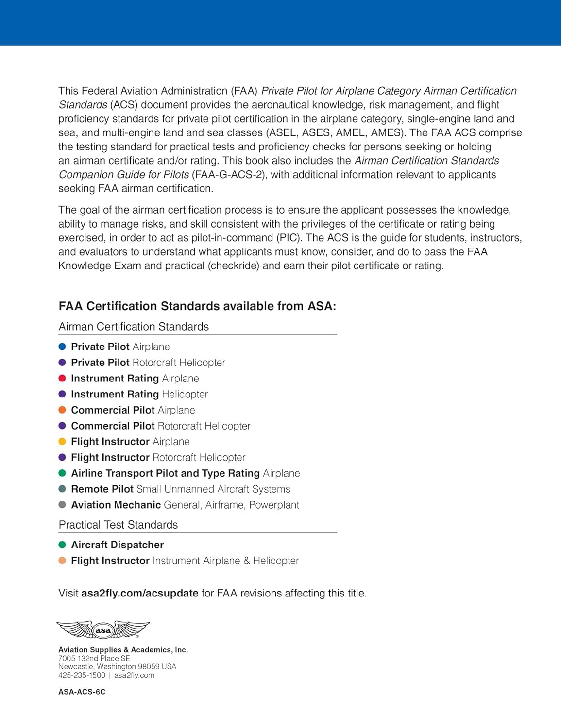 This Federal Aviation Administration (FAA) Private Pilot for Airplane Category Airman Certification Standards (ACS) document provides the aeronautical knowledge, risk management, and flight proficiency standards for private pilot certification in the airplane category, single-engine land and sea, and multi-engine land and sea classes (ASEL, ASES, AMEL, AMES). The FAA ACS comprise the testing standard for practical tests and proficiency checks for persons seeking or holding an airman certificate and/or rating. This book also includes the Airman Certification Standards Companion Guide for Pilots (FAA-G-ACS-2), with additional information relevant to applicants seeking FAA airman certification.