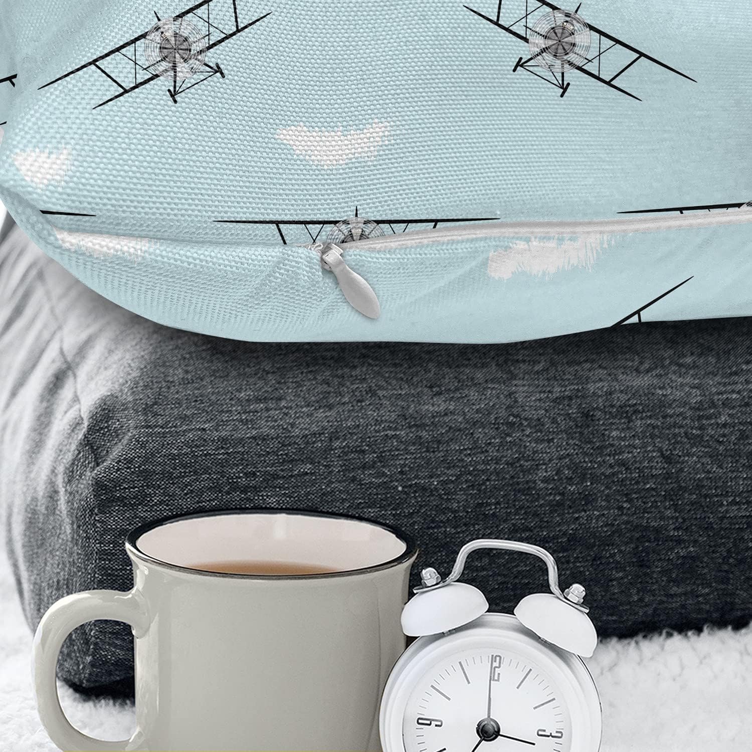 Ambesonne Airplane Throw Pillow Cushion Case, Old Aircraft Biplanes in Blue Sky Speedy Propellers Wings Retro Design, Decorative Square Accent Pillow Cover, 20″ X 20″, Pale Blue Black White