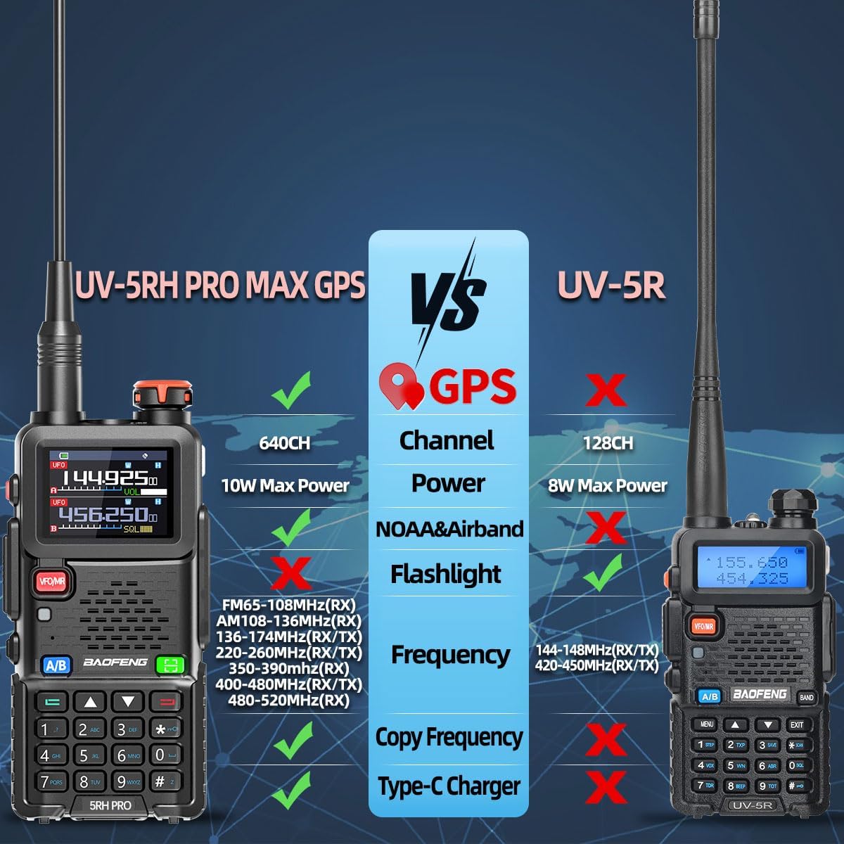 Professional Ham Radio:Up to 640 storage channels and a 1.77 inch large color screen, making operation more convenient.The enlarged walkie talkie body size is designed ergonomically to enhance user feel.GPS Function :In this functional mode, you can view, share, and request location information. Easily share your location with peers and enhance teamwork,and enable your companions to find you in a timely manner when you are in danger.Multiple Charging Methods:Each Radio equippend with USB-C Charging Cable+US Base Charger+2500mAh Rechargeable Larger Battery,you can easily charge it from power bank、PC、car、wall、laptop and any usb slot and long standby time.Frequency Copy:You can easily copy the frequency of other walkie talkies to avoid complex frequency programming steps.NOAA Scan & Receiver:With 10 weather channels to scan and receive weather reports from, let you know when bad weather will arrive and make sufficient preparations in advance.