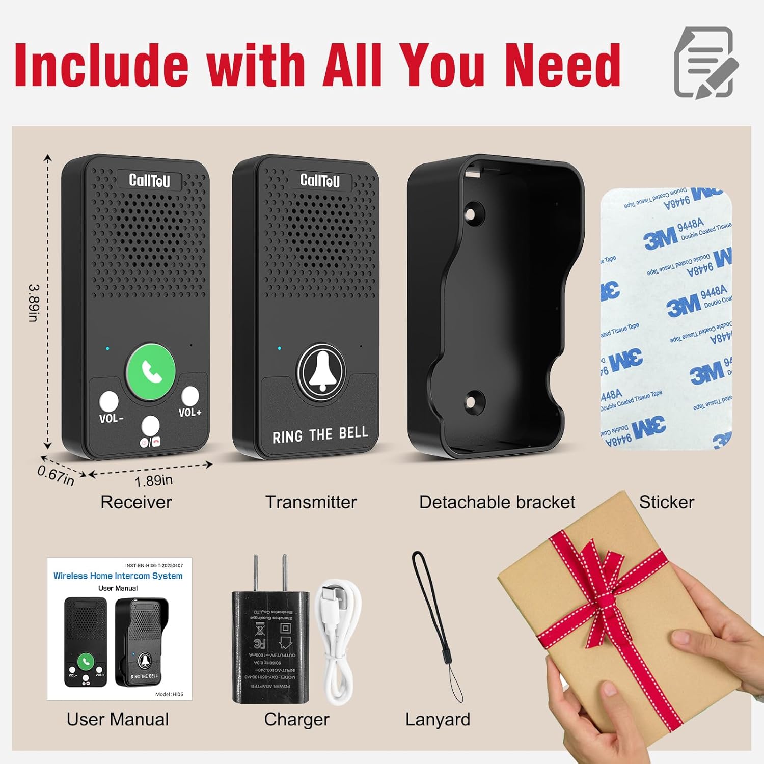Package: All essentials (receiver, transmitter, charger, etc.) for immediate intercom setup.