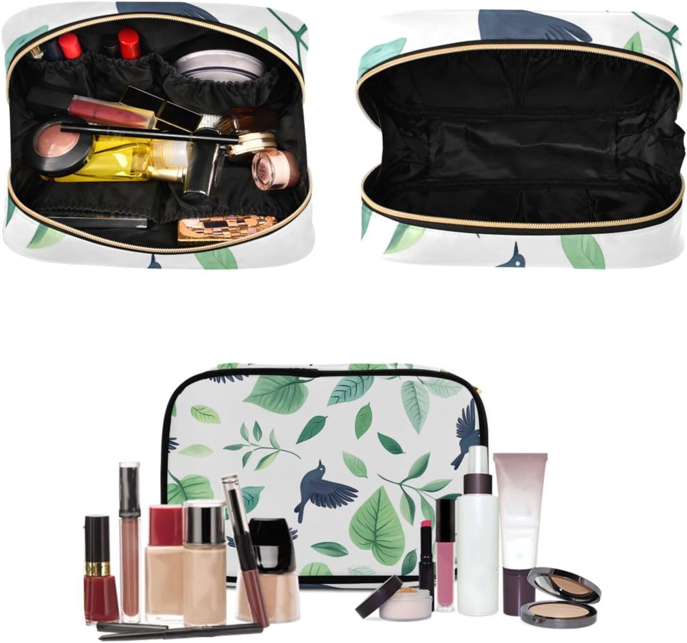 Cosmetic Pouch: Features a durable two-way zipper design. The main zippered compartment includes five elastic pockets for organizing eyeshadow, loose powder, eyeliner, lipstick, and other makeup essentials.