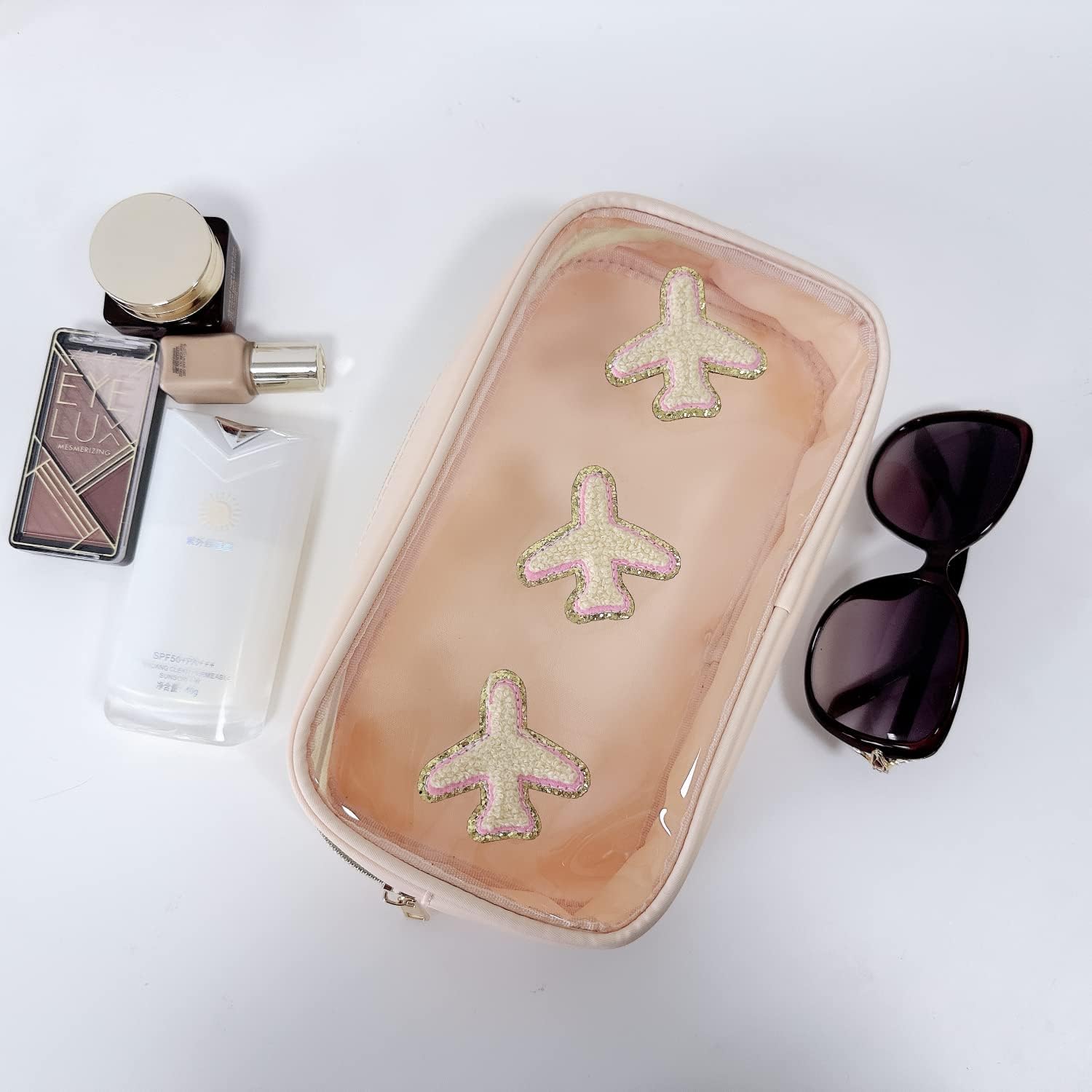 Letter bag size:This flight letter patch makeup bag is 9.65x 1.96 x 5.11 inches.This clear cosmetic bag has enough space to store makeup, snacks, toiletries, travel beach essentials and daily necessities. Ideal as a clear makeup bag for beach, travel, gym, bathroom, daily carry-on bag.