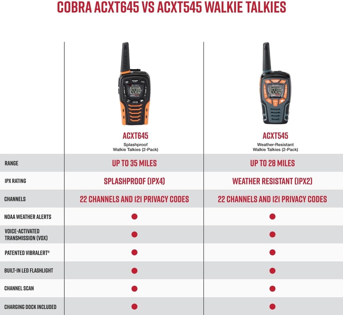 The Cobra ACXT545 is a rugged, weather-resistant two-way radio/walkie talkie with additional features for recreational or business use. With up to 28-mile range, Water Resistant (IPX2) Rating, NOAA Weather Alerts, VibrAlert® feedback for incoming transmissions, built-in LED flashlight and more, the ACXT545 is great for clear communication and emergency preparedness.