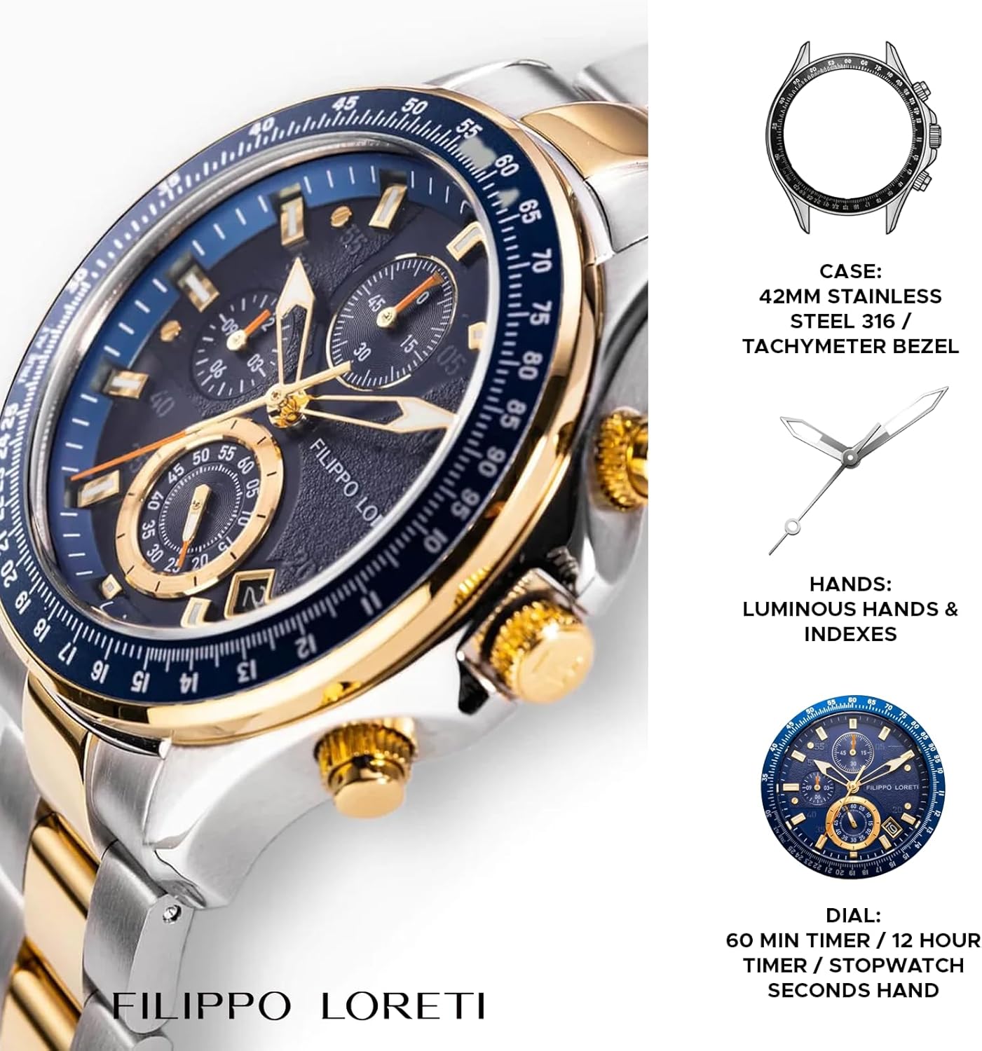 I have a hard time passing up a well-designed chronograph, and this FILIPPO LORETI Sport Pilot absolutely caught my attention. The blue dial paired with the two-tone silver and gold case and bracelet looks stunning in person—elegant without being flashy. It’s one of those watches that immediately elevates your look, especially for date nights or evenings out.The mecaquartz movement keeps excellent time and gives the chronograph a satisfying, precise feel. The 42mm case wears comfortably on the wrist, and the overall build quality feels solid and refined. Between the design, accuracy, and versatility, this is a beautiful timepiece that punches well above its weight in terms of style and value.
