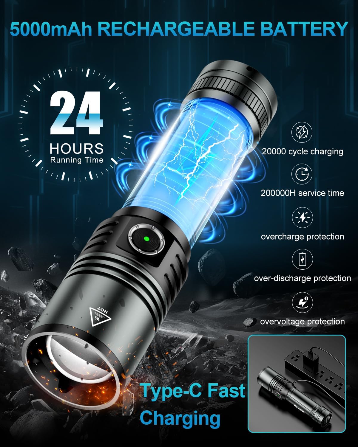 【Type-C Fast Charging & IPX6 Waterproof】The high powered flashlight with a built-in 5000mAh battery can reach 80% charge in just 1.5 hours using Type-C fast charging cable. Built for extreme conditions with IPX6 waterproof rating, 10ft drop resistance, and operational range from -20°F to 140°F – ready for any harsh conditions