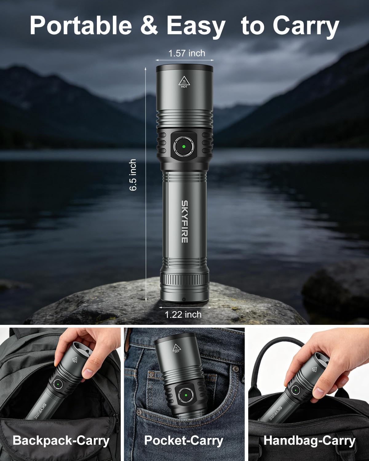 【1500 Lumens Beam & Lightweight】 Ample brightness and lightweight construction! The LED flashlight rechargeable delivers 1500 lumens with 3280 feet beam-Fully meet daily brightness needs. Featuring a lightweight design measuring 6.5 x 1.57 x 1.22 inches, the flashlights is highly portable and easily fits into pocket, backpack, or handbag without taking up excessive space