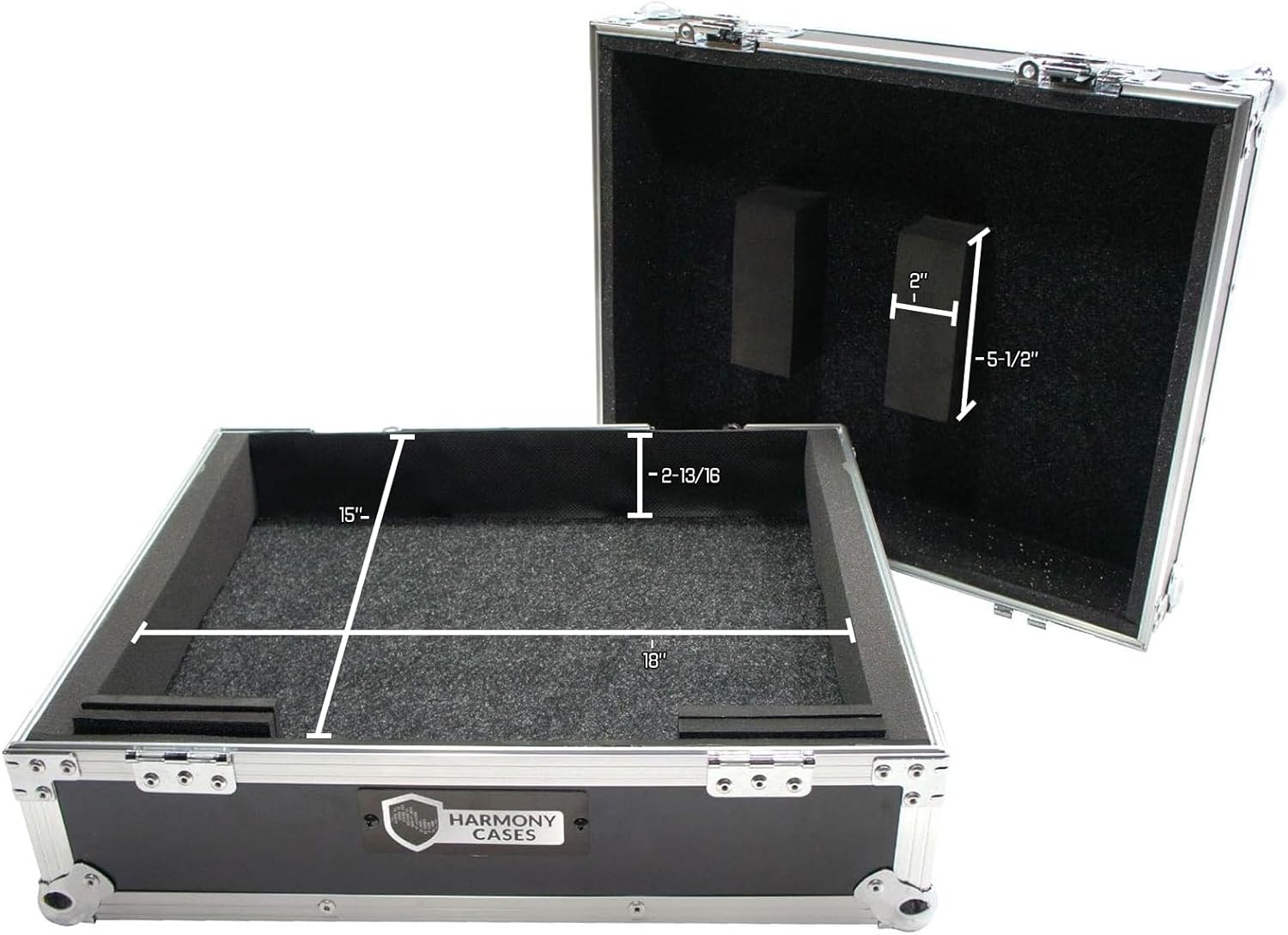 The interior of Harmony Cases are lined with carpet to ensure nothing gets scratched. Custom shaped pieces are foamed to give your gear a snug fit making sure it stays in place. From the outside to the inside you will have the peace of mind that your equipment is in great shape.