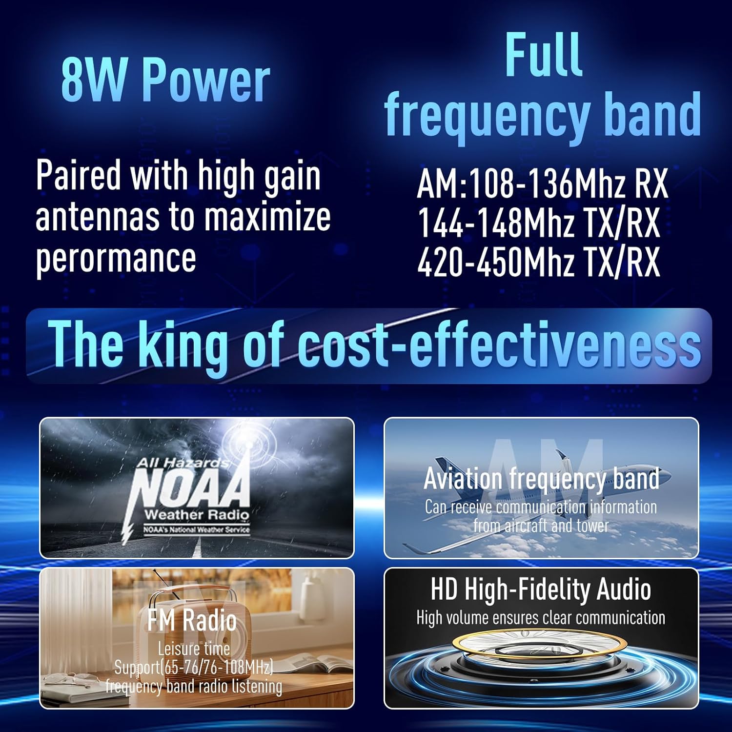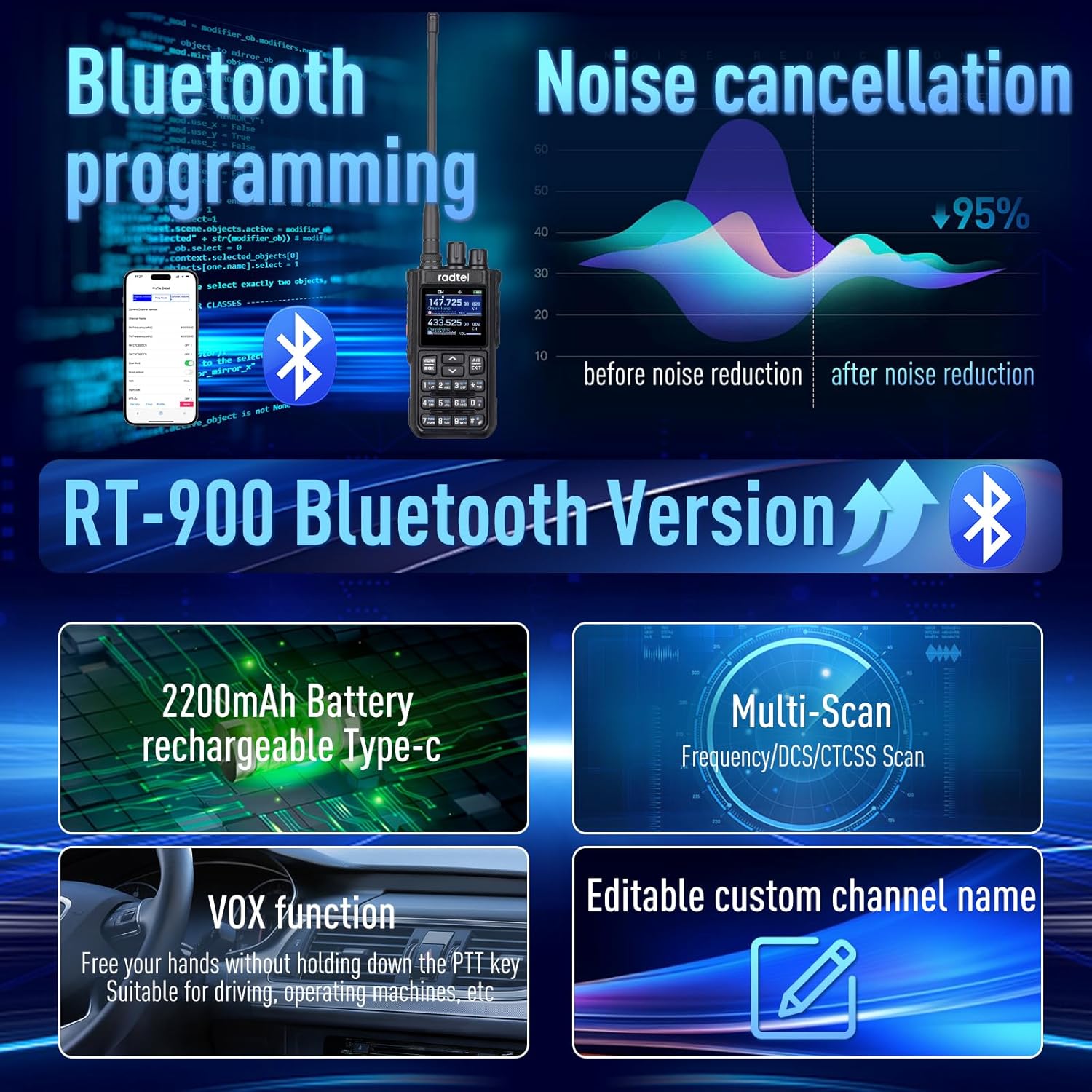 Radtel RT-900 8W Multi-Band Ham Radio Handheld Walkie Talkie with Noise Reduction, 256 Channels VHF/UHF Two-Way Radio, NOAA, 2200mAh Battery, Frequency Seek, Aviation, App-Programming