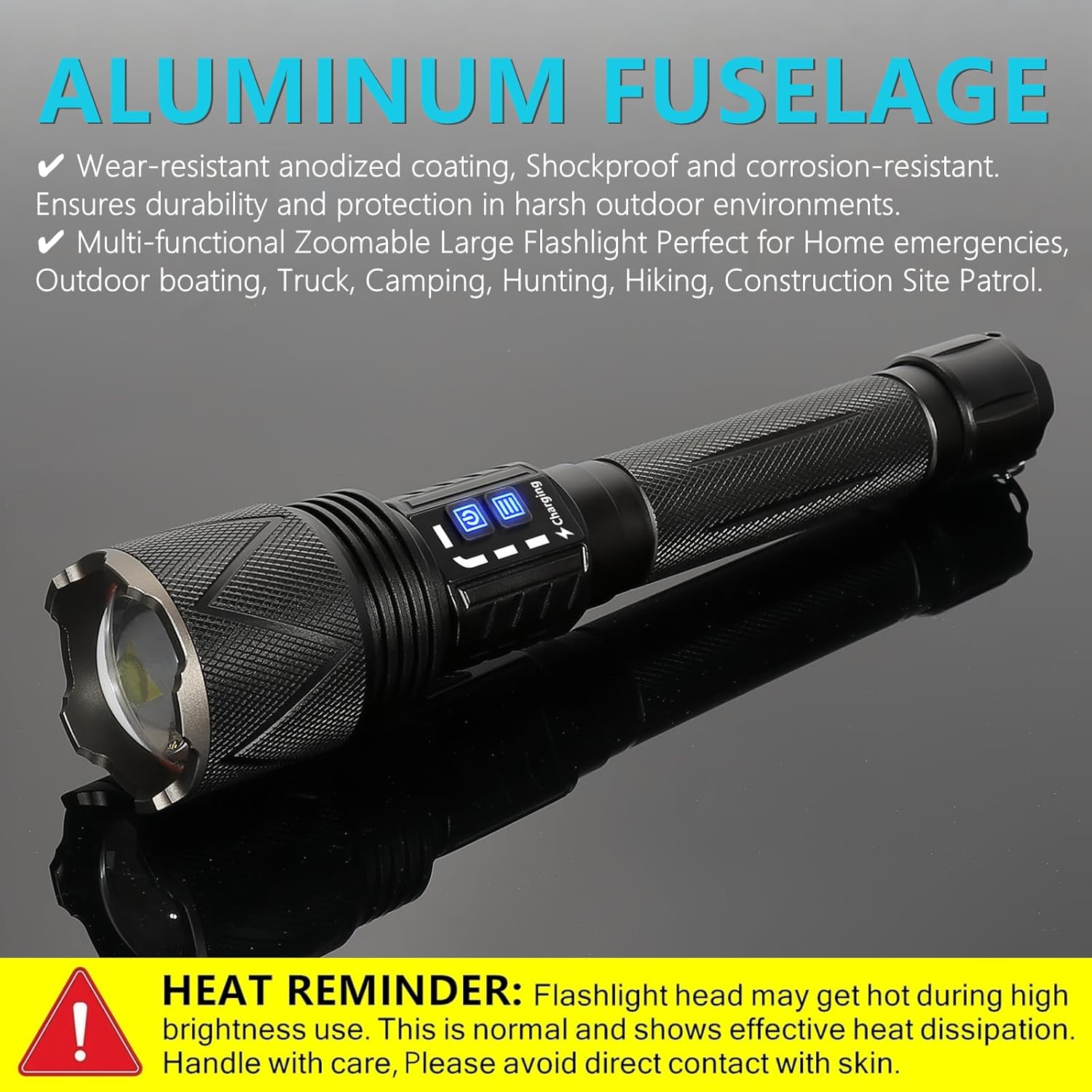 Multi-functional Zoomable Large Flashlight with 6 lighting modes Perfect for Home emergencies, Outdoor boating, Truck Driver, Camping, Hunting, Hiking, Construction Site Patrol.70W High powered flashlight head may get hot during high brightness use. This is normal and shows effective heat dissipation. Handle with care, Please avoid direct contact with skin.