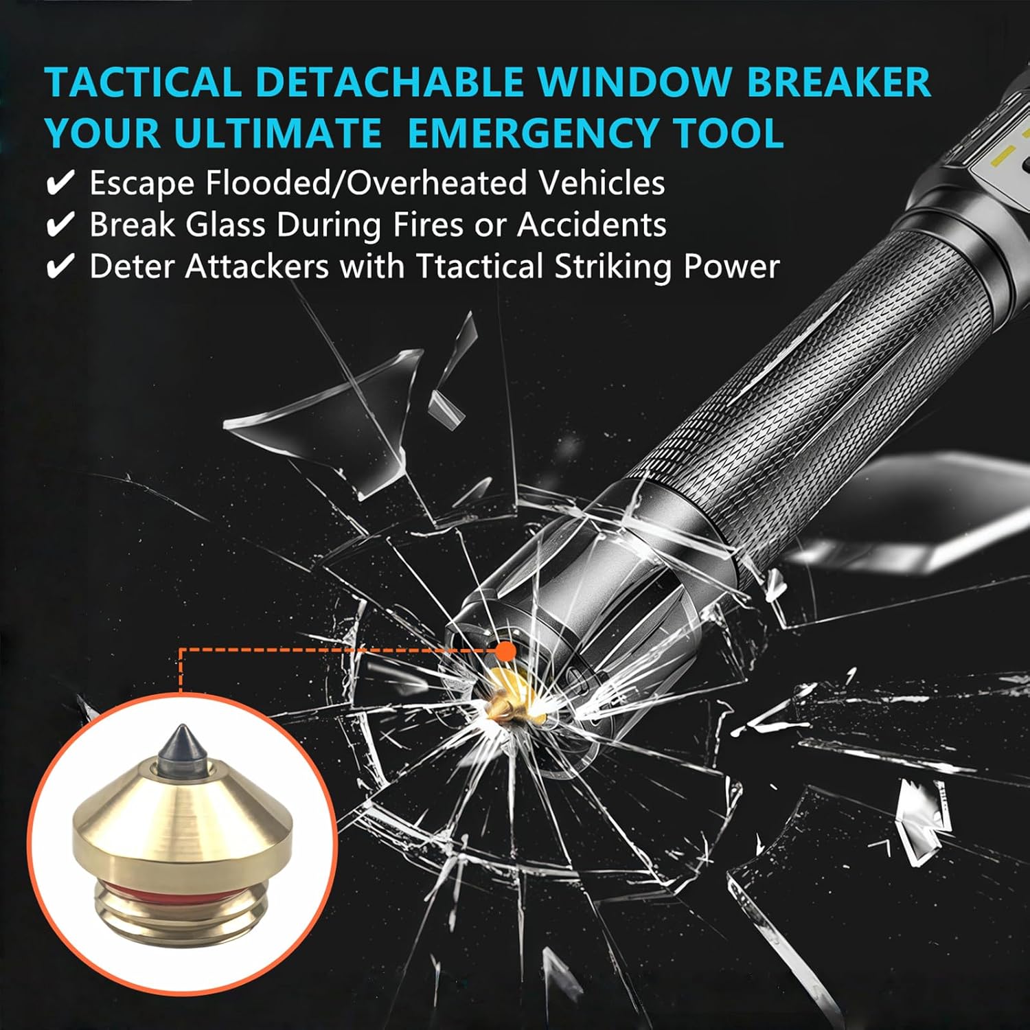 Tactical Detachable Safety Hammer, Your Ultimate Self-defense Tool, Instant Detachment – No tools required, releases from flashlight body in seconds for emergency use.Tungsten Steel Tip – Hardness HRC90+, shatters tempered glass/ice instantly, Anti-Slip Grip – Diamond knurling ensures firm hold even with wet hands or gloves.
