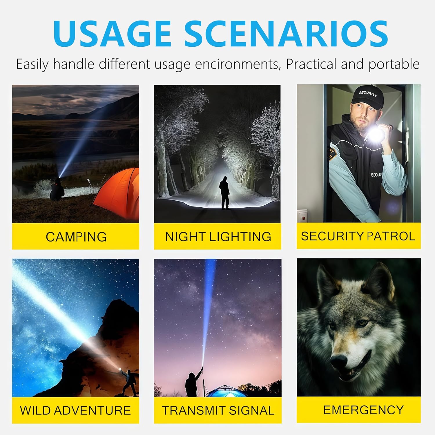 10,000 Lumens max output – Use high power 70W XHP360 LED, delivering daylight-like brightness.500m Extreme Beam Distance – Spot targets clearly at long range, perfect for search & rescue missions.Professional Performance – Outshines standard flashlights by 300%, It is much brighter than XHP50/XHP70/XHP90/XHP160 lamp beads.