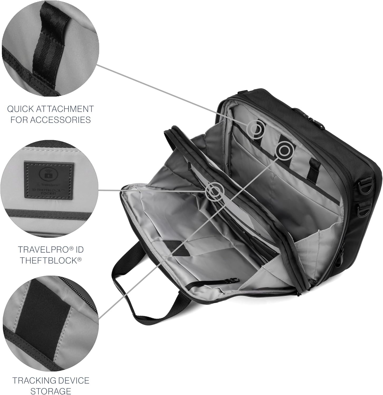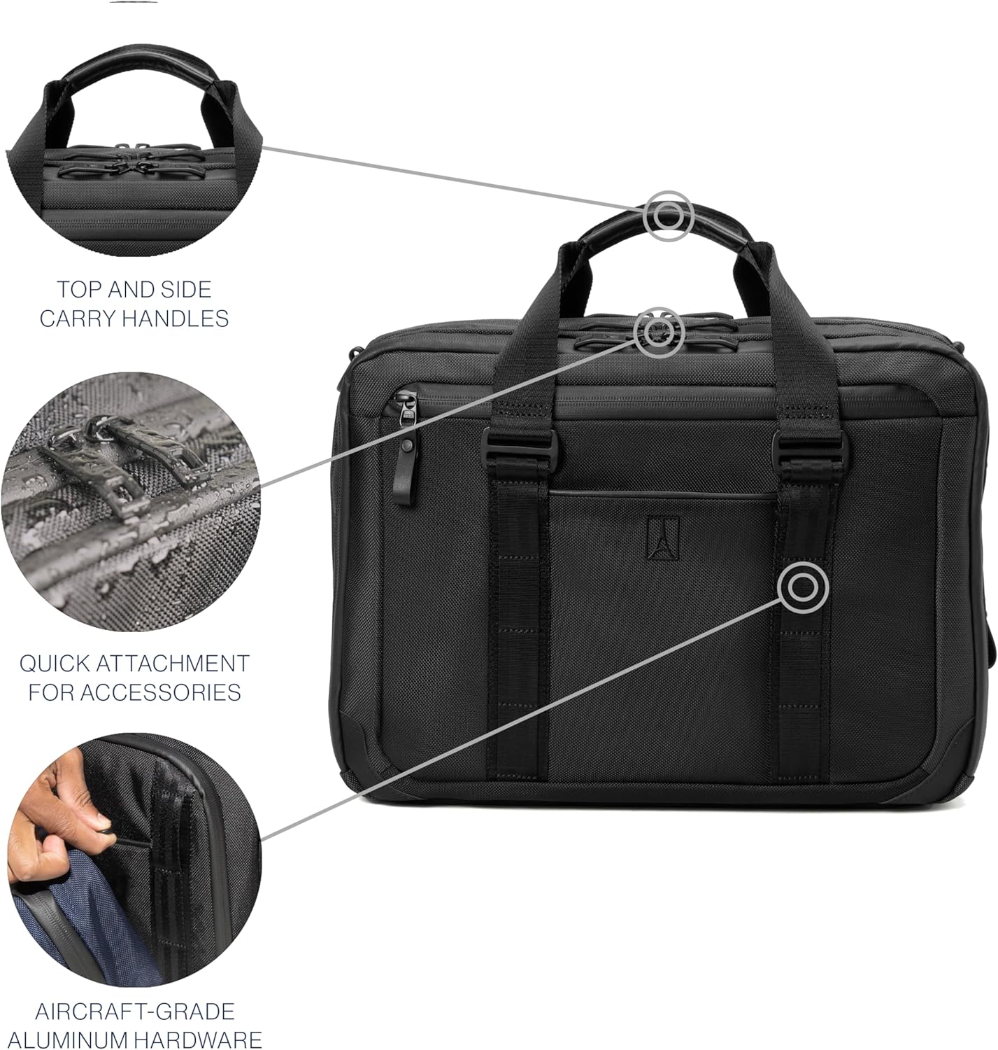This is a great briefcase for jetsetters and business travel. It has replaced my TravelPro Crew3 backpack as my go-to airplane bag. It fits perfectly under an airplane seat and allows space for your feet (as opposed to a backpack). The organization inside is well thought out and convenient with many zippers/pockets. I also like the exterior attachment points for carabineers.I tried both this item and the TravelPro platinum elite briefcase, but kept the Altitude bag. Although The platinum elite bag is much more handsome, the zippers were less robust, the storage wasn’t as well thought out, and seemed smaller overall.I only have two real issues with this bag 1) the handle should have one of those ‘clip together’ options to keep the handles from flopping down. Many TravelPro bags have this and it feels like a miss here. 2) an exterior water bottle spot would make travel easier. There is room inside for a bottle but you run the risk of leaks.
