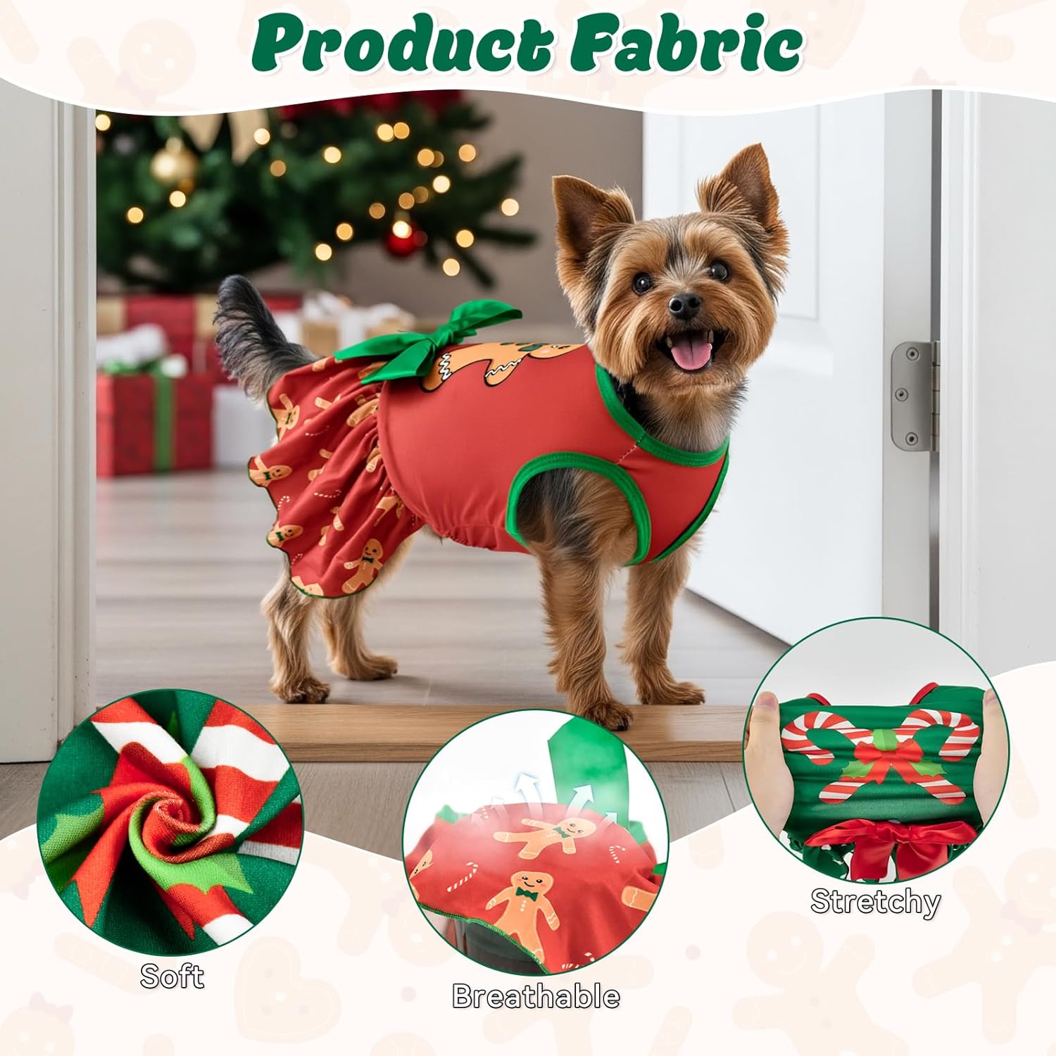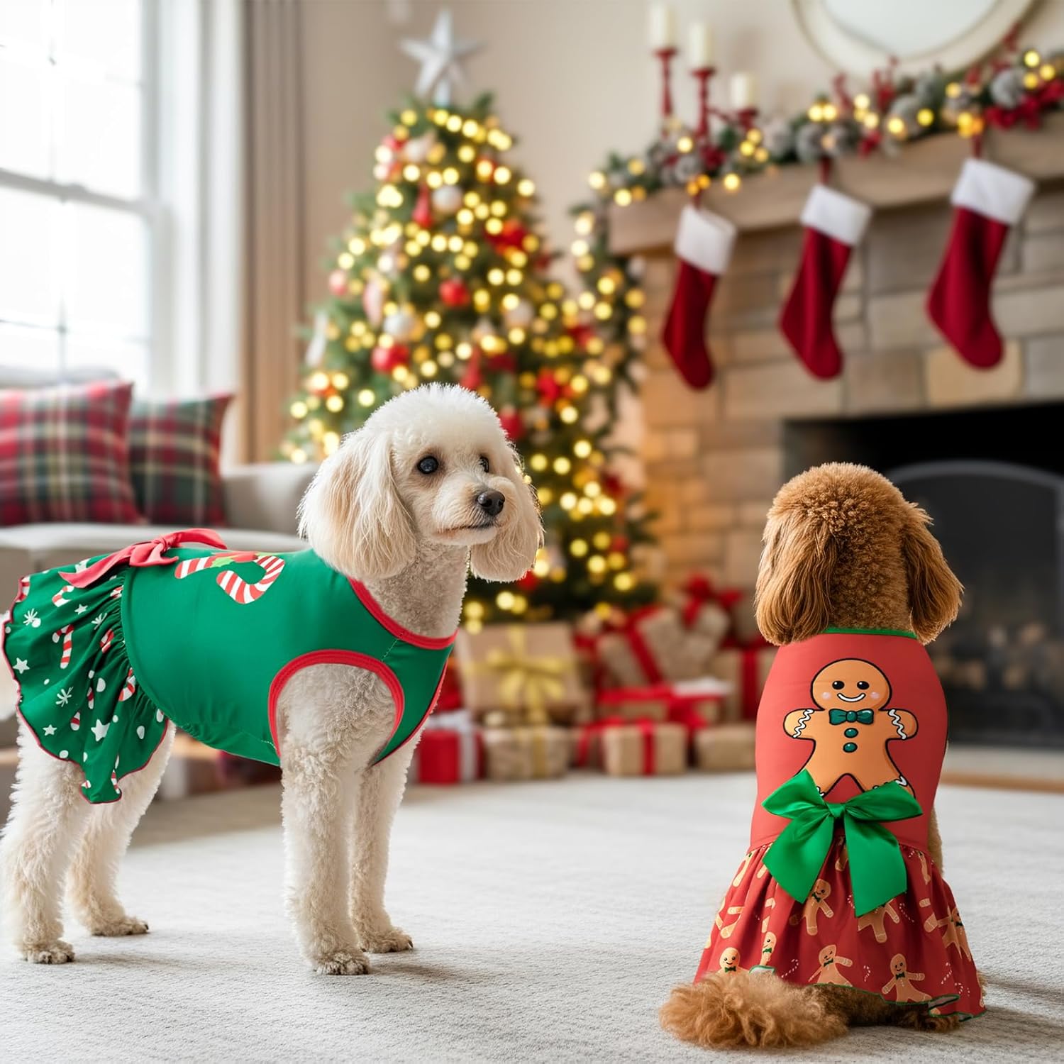 With festival color and patterns of Christmas canes, gingerbread men, the puppy 2pcs dresses are special for Christmas day.