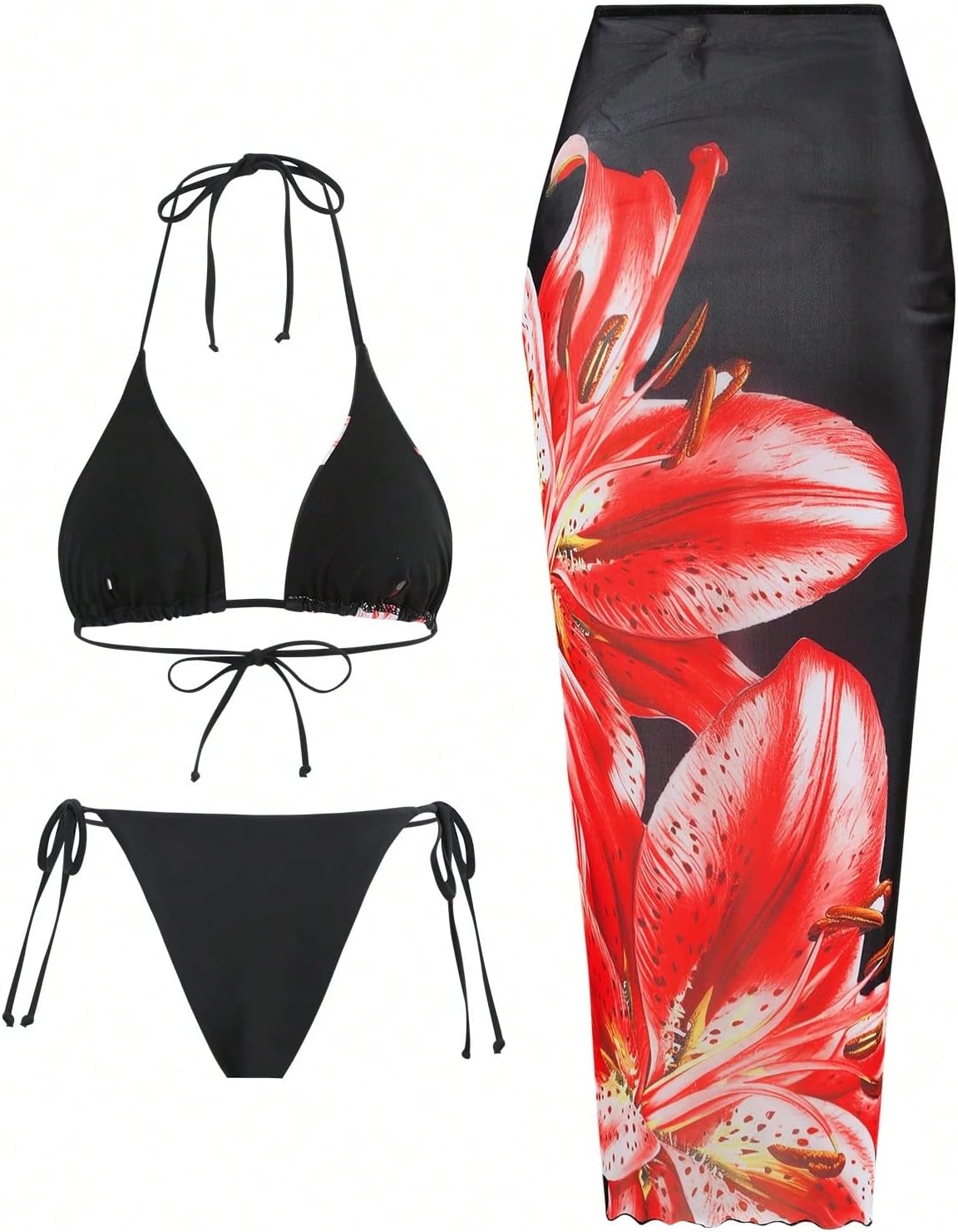 8 reviews for ZAFUL Womens 3pcs Swimsuit Floral Halter Triangle Bikini Top Tie Side Bottom with Long Sheer Cover Up Skirt